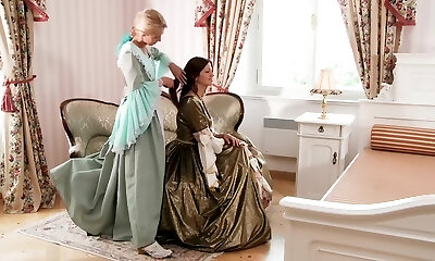 Seductive sapphic act with curly redhead babe and sunburnt maid