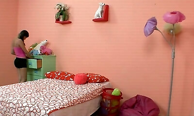 Filthy daddy is spying on sexy young babysitter jilling off pussy in the living guest room