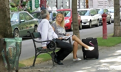 Curvy blonde flight attendant gets pounded hard by an older dude