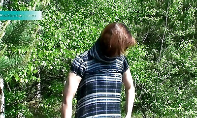 Chubby European redhead crouches and pees in the park