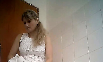 Fine curvaceous blonde lady in white dress filmed in the rest room room